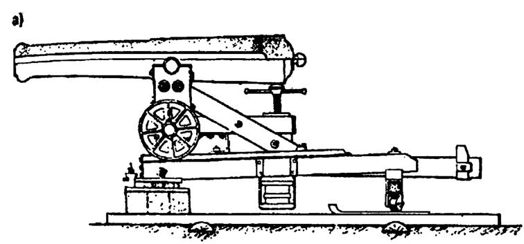 К 1860 г. в русской крепостной артиллерии состояли орудия образца 1805 г. и образца 1838 г. Разумеется, речь идет о крепостях I и II классов, а где-нибудь в Сибири в небольших крепостях встречались и пушки времен Ивана Грозного. Ору. дия образца 1838 г. мало отличались от орудий системы 1805 г., введенной Аракчеевым. В частности, были убраны излишние фризы и пояса.