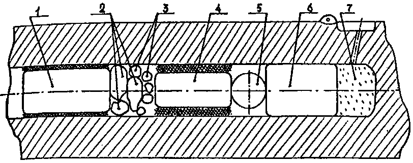 Схема 7. Схема расположения заряда, извлеченного из канала ствола пушки «Лев». 1o— пыж диаметром 119 х 183 мм, дерево; 2-дробь ок. 70x60x40 мм, камень; 3o— картечь диаметром 23 мм и 30 мм, чугун; 4o— пыж диаметром 93 х 166 мм, дерево; 5o— ядро диаметром 91 мм, чугун; 6o— пыж диаметром 124 х 163 мм, дерево; 7o— остатки пороха