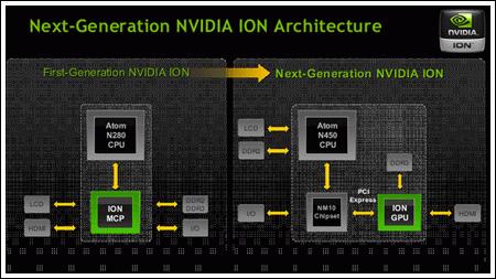 Пожалуй, самое важное событие CeBIT 2010 — презентация платформы NVIDIA Ion "следующего поколения". Как и в случае с "системой на чипе" Tegra, NVIDIA почему-то предпочла не использовать в названии второй версии платформы цифру 2, заменив её на расплывчатое определение Next Generation. Новый «Ион» в два раза производительнее «Иона» старого. Кроме того, по утверждению NVIDIA, он в пятнадцать раз быстрее графических решений Intel, предназначенных для нетбуков и миниатюрных настольных компьютеров.