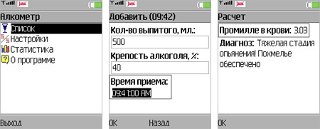 Нет поддерживающего технологию Java ME сотового телефона или смартфона? Ничего страшного. Всегда можно воспользоваться аналогичными программными решениями для других мобильных платформ. Например, на этом сайте представлен алкотестер NoFlite для Palm-совместимых девайсов, тут хранится алкогольный калькулятор для Windows Mobile, а изучив витрину онлайнового магазина AppStore, не составит труда найти шикарнейшее приложение iAlcohol для коммуникаторов Apple iPhone, которое не только хранит в своей базе свыше двухсот названий распространенных спиртных напитков, но и позволяет брать на карандаш всех находящихся за праздничным столом собутыльников. А что вы хотели — современные технологии!