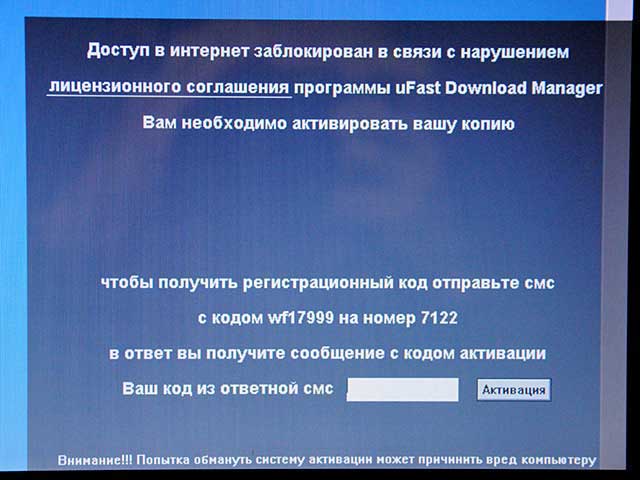 uFast Download Manager изображает из себя крутой «ускоритель загрузок», который вы якобы добровольно установили (на самом деле никто ничего не устанавливает — факевары распространяются интернет-рекламой и троянами), а затем «нарушили лицензионного соглашение программы», а потому в отместку программа заблокировала ваш доступ в Интернет. Мне лично мотив вымогательства очень нравится, потому как прекрасно коррелирует с нравственной парадигмой борцов за авторские права на электронную продукцию. Само же вымогательство примитивно как только и бывает у напёрсточников: «Чтобы получить регистрационный код, отправьте смс с кодом wf17999 на номер 7122».