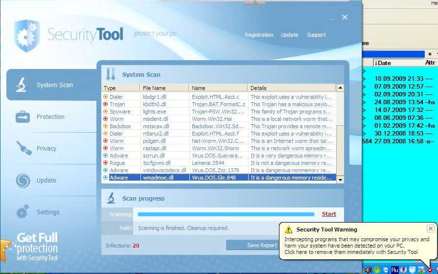 Гнида симулирует поиск инфекции на компьютере и «находит» её — кто бы сомневался! — в невообразимом количестве. На одном из зараженных домашних ноутбуков «было» аж 20 троянов, вирусов, шпионов, червей и рекламных модулей! Изобилие «отловленной» инфекции рассчитано, видимо, на истероидных юзеров, которые столкнувшись с подобным букетом сразу же ринутся покупать волшебный SecurityTool. Благо ходить далеко не нужно: тут же в окне услужливо размещена форма для оплаты банковской карточкой.