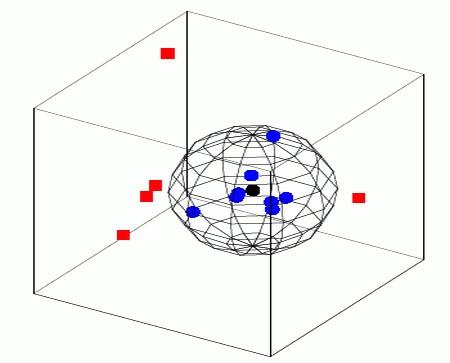 Графическое отображение этих результатов можно видеть на упрощённой трёхмерной схеме "взаимных расстояний", где плотно сгруппированные синие кружочки