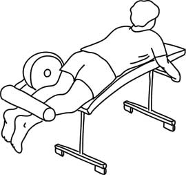 Лечь в тренажер для выполнения сгибаний ног лежа и выбрать комфортный вес, который позволит выполнить 12–15 повторений.
