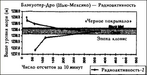 В Маррей-Спрингс Вэнс Хэйнс сказал мне, что «черное покрывало» имеется также и в Блэкуотере. Подтвердив это, Джоанн повела меня в центр — большое здание, построенное, чтобы закрыть одно из важнейших мест раскопок и защитить его от непогоды и грабителей. Когда мы вошли внутрь, чтобы взять образцы почвы для анализа нейтронной активацией и активацией гамма-лучами высокой энергии, я подошел к срезу земли, чтобы посмотреть на «черное покрывало». Оно было не столь темным, как в Маррей-Спрингс, но практически идентичным по текстуре и внешнему виду — и оно было всего в несколько футов толщиной.