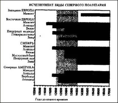 Мид и Мелцер (1984) пришли к выводу, что это вымирание могло завершиться примерно 12,9 тысяч лет назад, а это соответствует нашему мнению о времени катастрофы. Но трудно представить, что охотники ледниковою периода, охотившийся в Азии и Европе на протяжении десятков тысяч лет с каменными копьями, могли внезапно уничтожить миллионы зайцев, оленей, гиен, бизонов, саблезубых тигров, медведей, мамонтов, верблюдов, лошадей и быков. Без сомнения, охота оказывала влияние на популяцию этих животных, но здесь должен был присутствовать еще какой-то фактор.