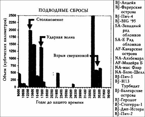 Скорее всего, сбросы у берегов Каролины были первыми, поскольку они были ближе всего к месту столкновений. Когда произошел сброс, огромное количество вещества двинулось вниз по подводным утесам со скоростью самого быстроходного катера, порождая многочисленные цунами. Эти огромные приливные волны двинулись через Атлантику со скоростью примерно 400 миль в час, чтобы обрушиться на Африку и Европу и вызвать здесь три сброса