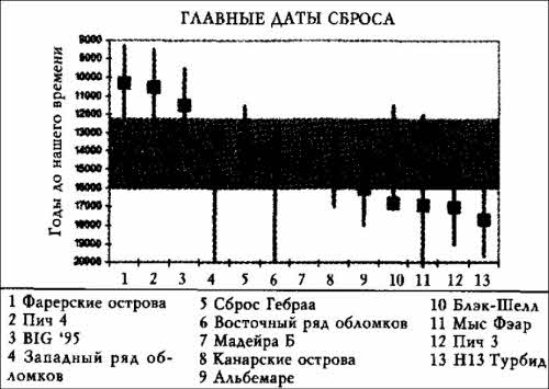 На илл. 33.4 мы изобразили на графике возможные даты вместе с полосами разброса дат, согласно данным Мэслина и его коллег. Где погрешность была неизвестна, мы взяли разброс плюс-минус 2 тысячи лет. График показывает, что тринадцать сбросов могли произойти между прибытием ударной волны 16 тысяч лет назад и концом столкновения с кометой где-то позже 12 тысяч лет назад.