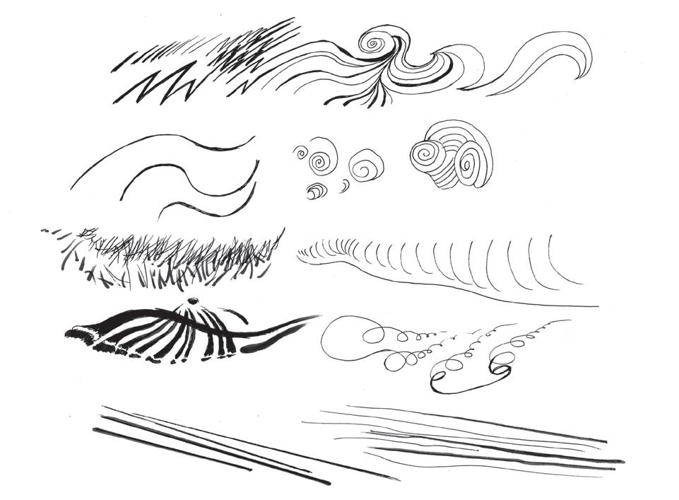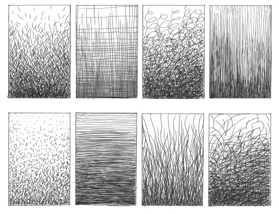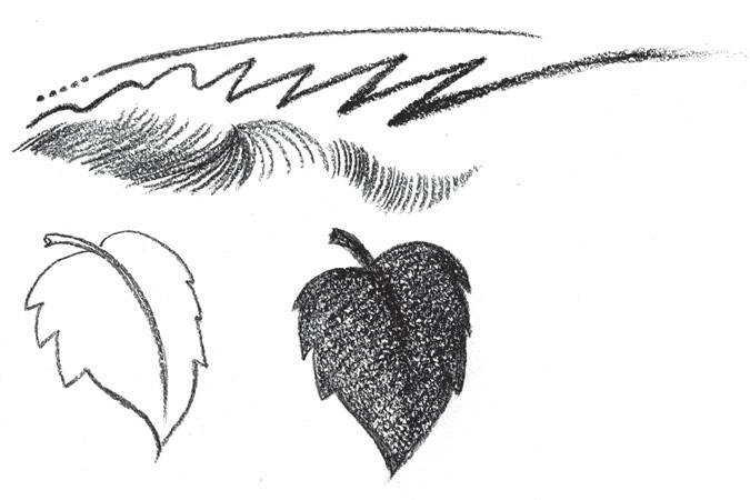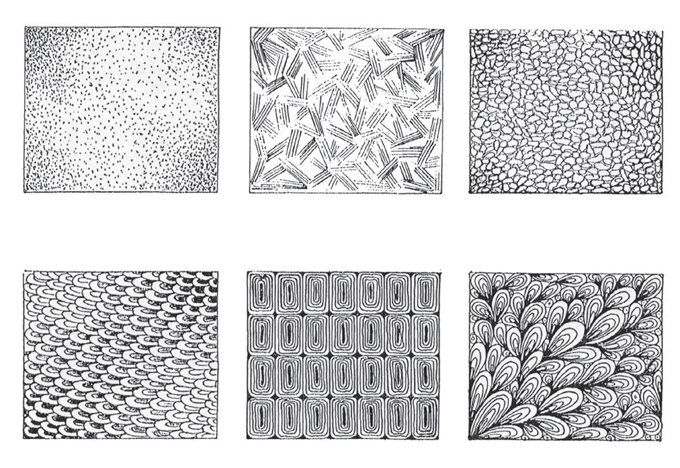 Линейная штриховка может быть очень разной – не только в разных направлениях, но и с имитацией каких-то материалов: ракушек, камешков, иголочек или песка. Посмотри внимательно на эти примеры: