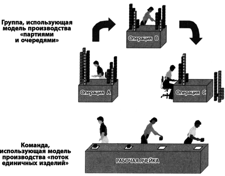 Рис. 16.1. Производство партиями и поток единичных изделий: работа в команде