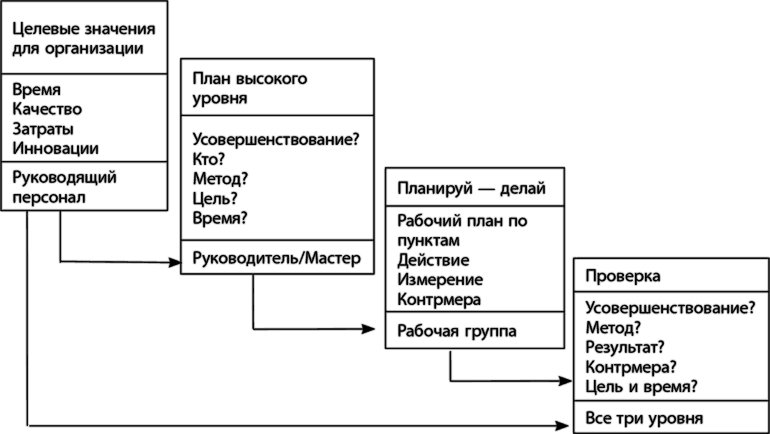 Руководство Toyota прекрасно владеет мастерством постановки стимулирующих целей, привлекая к участию в этом и подчиненных, и уделяет огромное внимание обратной связи и оценке результатов. Это является основой хосин канри (о котором уже рассказывалось в главе 17, где рассматривалась конкретная ситуация в компании Trim Master). Хосин канри, или как его иногда называют «развертывание политики», представляет собой применяемый в Toyota процесс детализации целей, начиная с высшего руководства компании и заканчивая уровнем рабочих групп. На основе далекоидущих целей, поставленных перед руководством, для каждого уровня разрабатываются собственные измеримые задачи на год, обеспечивающие реализацию целей высшего уровня. В Toyota считают, что такие задачи должны быть измеримы и предельно конкретны. Нечеткая формулировка цели неприемлема. На рис. 20.4 показано, как происходит нисходящая детализация целей в организации с учетом цикла PDCA.