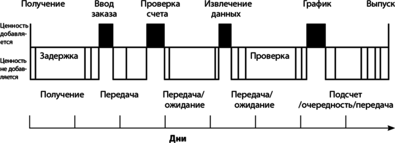 В организациях, занимающихся административными вопросами или работающих в сфере оказания услуг, люди сидят за столом, работают на компьютере, обсуждают различные вопросы, проводят совещания и обычно заняты разными делами. Выявить поток в их работе далеко не так просто, как проследить физическое перемещение изделия по мере его преобразования на производстве. В организациях сферы услуг часто ведется несколько проектов, которые существенно отличаются по объему работ, сложности, числу людей, принимающих участие в их реализации, и времени выполнения заказа. Но если вы начнете с потребителя, выявите ценность и затем составите карту процесса, в ходе которого создается добавленная ценность для потребителя, вам будет не так уж сложно определить
