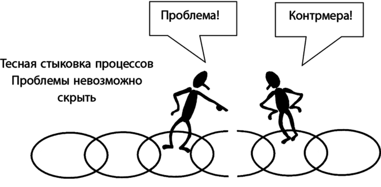 Идеал TPS – поток единичных изделий. Однако, как мы уже видели в данной книге, преимущества потока проистекают из тесной стыковки процессов, которая позволяет выявить проблемы, как показано на рис. 21.2. Когда вы объединяете процессы в единый поток, проблемы не могут укрыться за запасами или в очередях на переработку. Когда один отдел немедленно получает необходимую информацию от отдела, который ее поставляет, имеют место два момента: