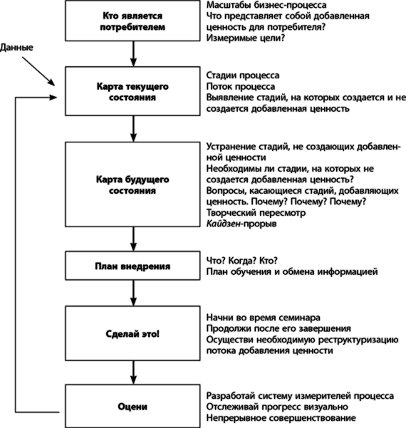 Более мелкие подпроцессы затем можно проработать в качестве отдельных проектов, проводя практические семинары по кайдзен, которые помогут осуществить блиц-мероприятия в сжатые сроки. Семинар по кайдзен представляет собой один из важнейших инструментов для изменения любой организации сферы услуг. Я говорю о мероприятии, которое я и мои коллеги многократно с успехом использовали, чтобы прояснить ситуацию и показать, чего можно достичь. Как правило, такие семинары проводятся в течение недели, при этом участники анализируют существующие процессы, учатся рассматривать эти процессы с точки зрения бережливого производства и, что самое важное, уже приступают к реализации своих наработок [41] .