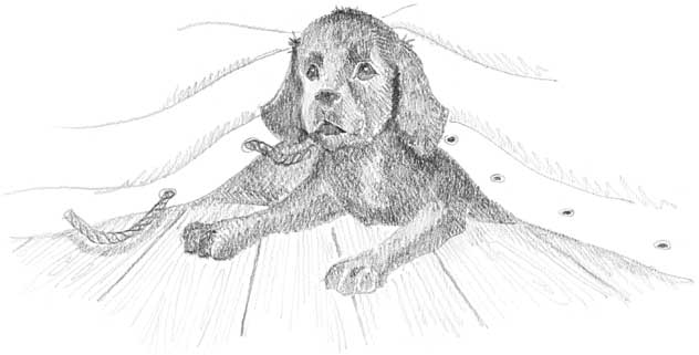 Щенок навострил уши и услышал слабый гул. Кажется, они уплыли недавно! Щенок, вытянув шею, всмотрелся в даль. Вот они! А вон Энн на носу лодки!