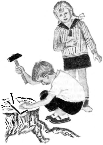 «Раз, два, три!» — отсчитывает она вслух. И, если вместе с командой «три» из-под молотка вылетает удар весёлый, твёрдый, значит, победа! Гвоздь ушёл в доску по самую шляпку. И тогда Таиска кричит «ура», и Илюша тоже. Потому что каждому человеку весело, если гвозди, даже самые скрюченные, распрямляются и вбиваются по его хотению.