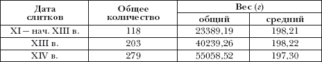 Следовательно, установить величину гривны серебра мы можем, выяснив вес «северных» слитков. Уже указывалось, что Н. П. Бауер считал их весовую норму (за которую он принимал норму среднего веса) равной 197 г, а Г. Б. Федоров настаивал на падении весовой нормы слитка от 204,756 г в XII в. до 195 г в XIV в. Исчисляя норму среднего веса слитков разного времени, мы можем проверить оба эти предположения. Хронологическая классификация русских денежных слитков и сводка всех данных о весовых показателях были опубликованы Н. П. Бауером [106] . Им приведены сведения о весе 118 экз. «северных» слитков XI – начала XIII в. [107] , 203 экз. таких же слитков XIII в. [108] и 279 экз. гривенных слитков XIV в. [109] Расчет среднего веса дает следующую картину: