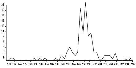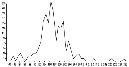 Рис. 2. Весовая диаграмма слитков северного веса XIII в. По 203 экз., опубликованным Н. П. Бауером в книге «Die Silber– und Goldbarren des russischen Mittelalters»