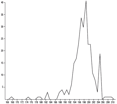 Рис. 3. Весовая диаграмма слитков северного веса XIV в. По 279 экз., опубликованным Н. П. Бауером в книге «Die Silber– und Goldbarren des russischen Mittellalters»