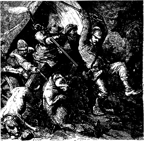 Мы хватаем оружие и готовимся отразить нападение таинственного врага. Проходит десять минут. Лай собак, начавший было теряться в отдалении, вдруг переходит в жалобные взвизгивания, и скорее, чем можно ожидать, пред нашими глазами появляются наши ищейки с окровавленными боками, разодранными ушами и искусанными мордами. Прибежав к нам, они с визгом бросились к нашим ногам. Мы не успели разглядеть их раны, как за ними показались и враги.