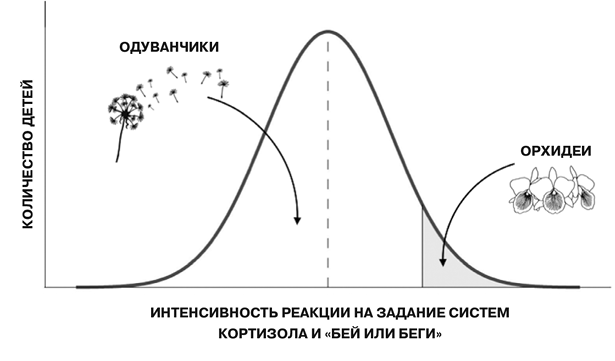 Распределение реакций на стандартизированные лабораторные задания систем кортизола и «бей или беги» у детей. На графике видно, что реактивность на стресс имеет равномерное распределение для всего спектра значений; дети-орхидеи обосновались в верхних значениях диапазона, а одуванчики – в нижних 80 % или 85 %.