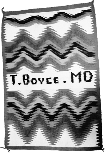Через полтора года после того, как мы с Джилом приняли на руки близнецов-навахо на высоте трех километров над границей штатов Нью-Мексико и Колорадо, я покинул резервацию и больницу для индейцев, чтобы приступить к своей первой самостоятельной работе на кафедре Университета Аризоны в Таксоне. Однажды по почте пришел загадочный пакет с обратным адресом, указывающим пункт где-то далеко на севере, в дикой, поросшей колючками пустыне Нью-Мексико. Внутри без какой-либо записки обнаружился симпатичный коврик, сплетенный в традиционном стиле индейцев навахо, с моим именем, вплетенным в рисунок: «Т. Бойс, врач». Его прислала бабушка близнецов.