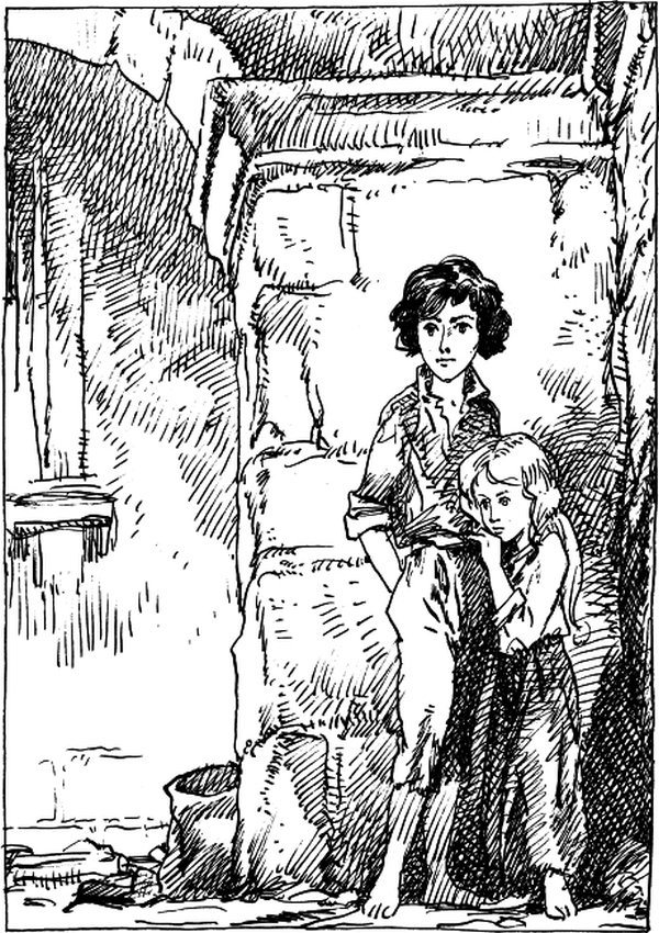 Между тем девочка, упершись маленькими ручонками в пол часовни, старалась тоже выкарабкаться из люка. Она падала, вновь приподнималась и наконец направилась нетвердыми шагами к мальчишке. Подойдя вплоть, она крепко ухватилась за него и, прижавшись к нему, поглядела на меня удивленным и отчасти испуганным взглядом.