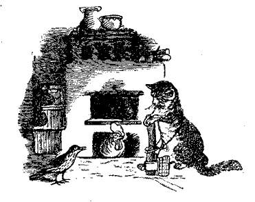Проведала лиса, что кота и дрозда дома нет, прибежала к избушке, села под окошко и запела: