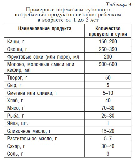 В табл. 4 показано, сколько и каких продуктов должен потреблять ребенок в возрасте от 1 до 2 лет в течение суток.