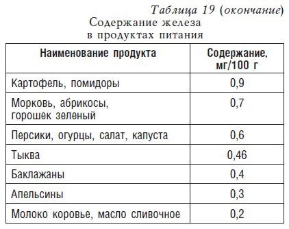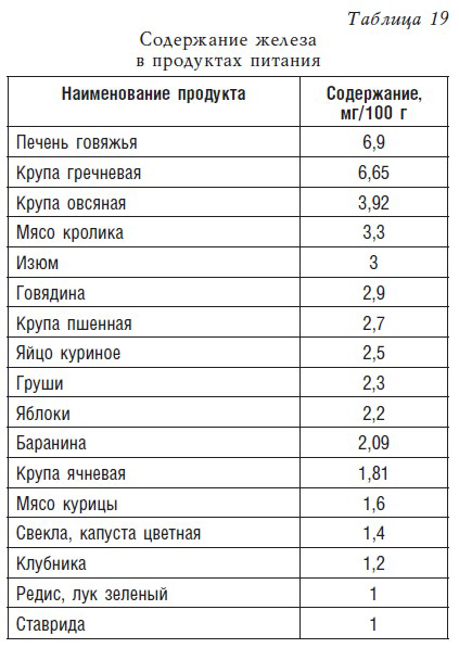 Железом особенно богаты субпродукты (печень, язык), мясо, яичный желток и рыба. Достаточно высоко его содержание в овсяной, перловой и гречневой крупах, а также в зеленом луке, петрушке, салате и фруктах.