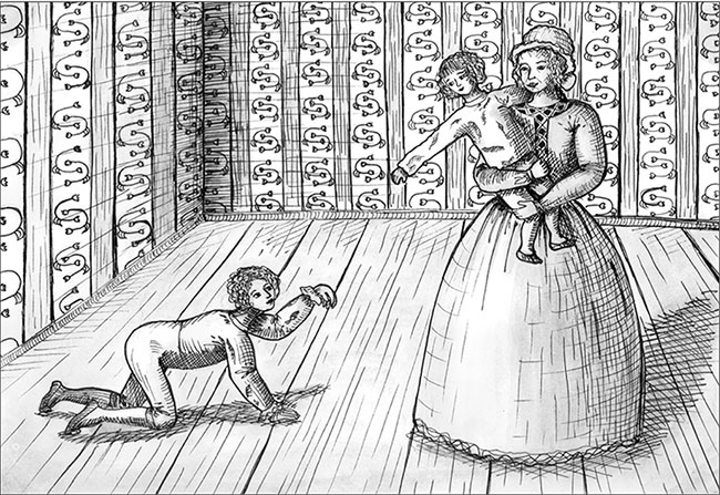 На шум вошла Арина Родионовна с Лёвушкой на руках. Выражение личика у брата было капризное. Ободрённый успехом Саша решил его посмешить. Он пригладил, как мог, непослушные вихры на голове, стал двигаться по – кошачьи плавно, степенно поворачиваться, нюхать воздух, тереться о стенку.