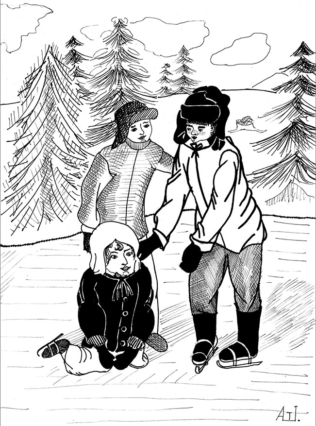 Раскрасневшиеся друзья берут Сашу под руки и тащат на лёд. У того с непривычки ноги разъезжаются, будто он пляшет. Оля с Варюшкой стоят на берегу, смеются и снежки в ребят бросают, а Жучка вокруг них прыгает и лает. Начинающему конькобежцу и самому смешно, но скоро и у него кое-что стало получаться. Гришка со Стёпкой – учителя что надо!