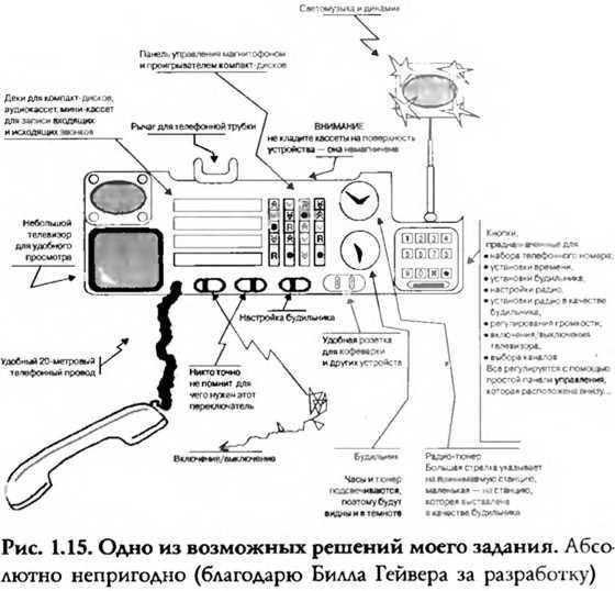 Каждый ответ я рассматривал с позиции некоторых требований к прибору. (Рис. 1.15 — неверное решение.) Первое требование: соответствие реальным нуждам потребителя. Я думал, что студенты для определения правильности дизайна многофункционального прибора должны посетить потенциальных потребителей. Второе требование: практичность и понятность кнопок, То есть может ли пользователь выполнить желаемую функцию без лишних ошибок. Обычно часами — радио пользуются в темноте, лежа в кровати и не глядя на само устройство. В приборе должна быть предусмотрена защита от случайных неверных нажатий кнопок. (Увы, не у всех часов— радио есть такая защита. Вы, например, можете сбросить время, случайно нажав не ту кнопку.) И третье требование: устройство должно быть относительно недорогим и эстетичным. Окончательная модель должна пройти тестирование среди потребителей. Цель задания в том, чтобы студент осознал технологический парадокс: многофункциональность вызывает сложности в эксплуатации, но грамотный дизайн сводит этот недостаток к минимуму.
