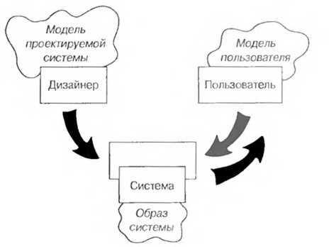 Рис. 1.10. Типы ментальных моделей. модель проектируемой системы — это концептуальная модель дизайнера. Модель пользователя — это модель, которая создается в результате взаимодействия с системой. Образ системы основывается на ее физической структуре (включая документацию, инструкции и ярлыки). В идеале модель проектируемой системы должна совпадать с моделью пользователя Однако дизайнер не общается с пользователем непосредственно коммуникация осуществляется через образ системы Непонятность и несовместимость модели проектируемой системы приводит к сложностям в