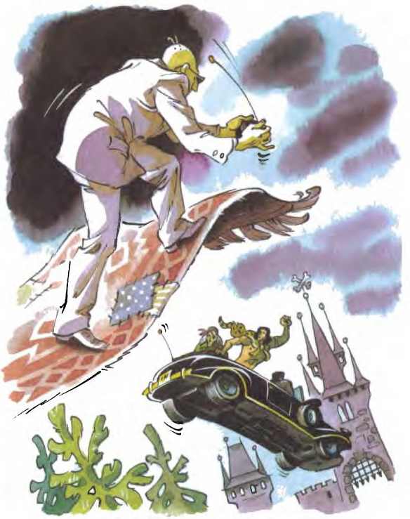 — Я же говорил, отечественные ковролёты надёжнее! — подлетая ближе, проговорил Кощей. — А машиной вашей я управляю по радио с помощью вот этого пульта. — Кощей показал невзрачную коробочку и похвастался: — Сам собрал по чертежам в «Юном технике».