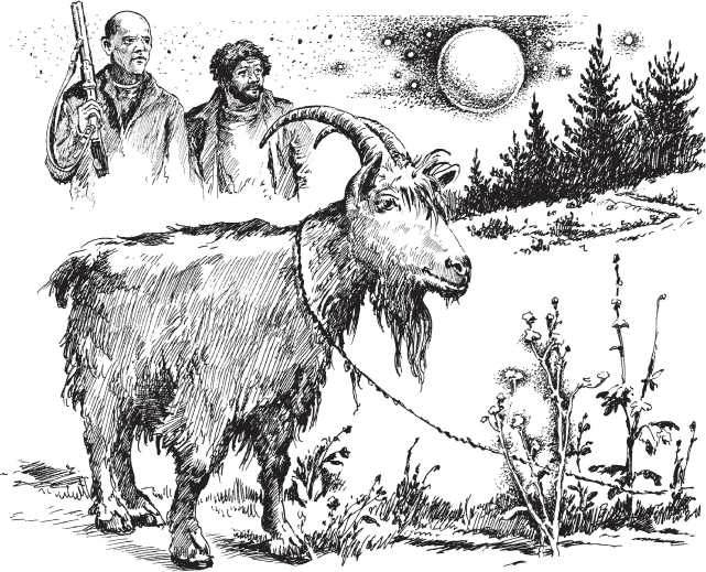 Но главная мудрость заключалась не в этом. Охотничья гениальность Саньки воплотилась в том, что метрах в сорока от стога бродил козел по имени Валет. Козел был привязан на веревке. С другого конца веревка крепилась за кол, воткнутый в землю. Валет и служил приманкой, он расхаживал вокруг кола, тряс своей козлиной бороденкой и беспрестанно блеял.