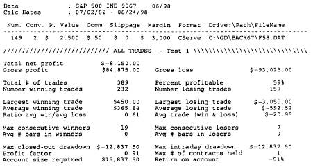 Рисунки 3.7 – 3.9, иллюстрирующие результаты простой и небольшой системы торговли фьючерсом на фондовый индекс S&P 500, подкрепляют эту точку зрения. Правило состоит в том, чтобы неизменно покупать на открытии каждый понедельник, если оно оказывается ниже пятничного закрытия. Это начало построения краткосрочной системы, поэтому пока не стоит очаровываться самой системой или ее результатами. Я стремлюсь здесь показать вам огромное преимущество понимания того, что можно сделать больше денег, если продержаться до закрытия.