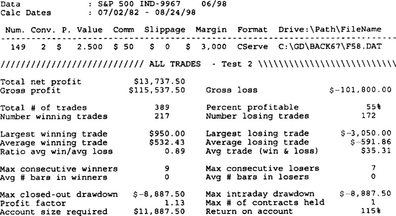 Следующий набор данных (Рисунок 3.8) иллюстрирует те же самые установки, кроме целевого лимита прибыли 1000$. На сей раз, мы зарабатываем 13737$, причем снова на том же самом числе сделок – 389, получая небольшую среднюю прибыль 35$ на сделку. Я списал 50$ на комиссионные (как и для всех других результатов, представленных в этой книге). Чтобы сделать наши 13737$, нам пришлось вытерпеть дродаун на 8897$ и закрыть в плюс 55 процентов из общего числа сделок. Факты говорят сами за себя. Трейдеры могут спорить до посинения о том, что работает, а что нет, но вышеприведенные цифры свидетельствуют в мою пользу. Лучше проявлять выдержку, не кидаться из стороны в сторону и дожидаться созревания перспективных позиций.