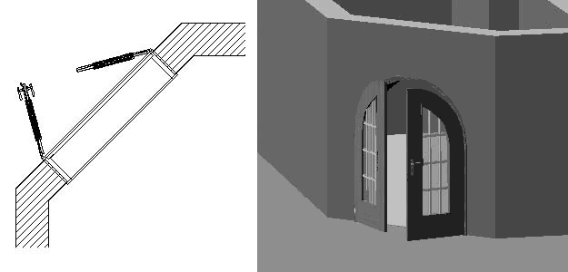 Следующий шаг – добавление дверей. Поскольку разрабатывается первый этаж, будут добавляться два типа дверей – наружные и внутренние. В ArCon нет четкого разделения дверей на наружные и комнатные, но о назначении двери свидетельствуют ее форма и габариты. Создадим парадный и черный входы, в качестве дверей между комнатами используем арочные проходы в стенах.