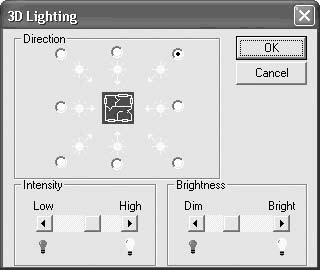 В этом окне в области Direction (Направление) устанавливается направление, откуда направлено освещение на объекты сцены. С помощью ползунков в областях Intensity (Интенсивность) и Brightness (Яркость) настраивается интенсивность и яркость источника света. Это окно вызывается также командой меню View -> 3D Lighting (Вид -> 3D-освещение).