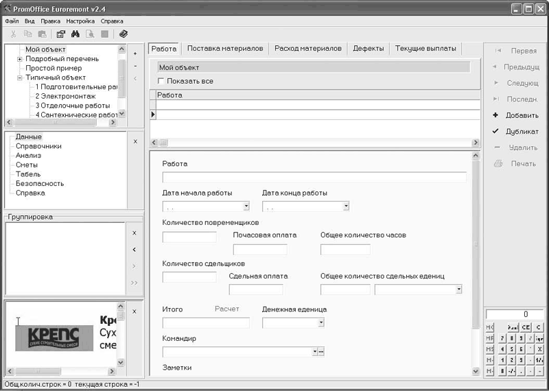 Окно программы PromOffice Euroremont (рис. 3.1) состоит из нескольких частей. Вверху находится горизонтальная панель с главным меню, под ней – панель инструментов. Остальную область окна занимают панели для работы с данными. В последней версии программы в правом нижнем углу главного окна добавлена панель с калькулятором.