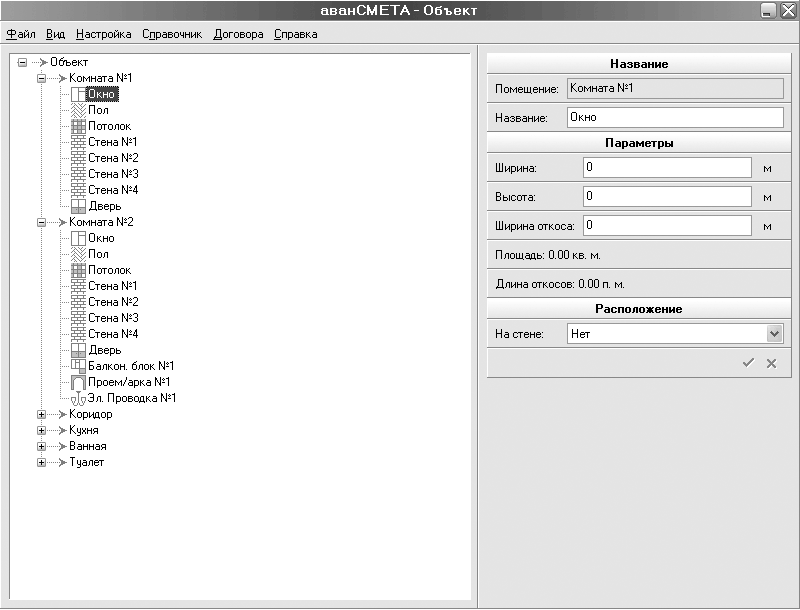Первым этапом работы с программой является создание иерархического представления помещений, для которых будут рассчитываться затраты на ремонт. Верхним элементом дерева по умолчанию предлагается Объект, в котором вы задаете общие параметры рассматриваемого объекта (дома или квартиры). На панели справа в соответствующих текстовых полях вводятся адрес объекта, общая площадь стен, окон, полов, потолка и пр.
