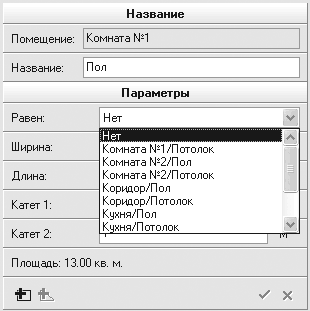 Есть еще одна удобная возможность устанавливать равенство данного элемента (пола, потолка, стены) любому из однотипных (имеется в виду пол, потолок или стены) текущего или другого помещения. Например, очевидно, что в одной комнате пол и потолок будут иметь равные размеры, или стена, разделяющая смежные комнаты, одна и та же, вследствие чего ее размеры должны быть одинаковыми для разных помещений. Равенство устанавливается в раскрывающемся списке Равен (Равна), в котором представлен перечень полов, потолков и стен для всех помещений объекта (рис. 4.9).