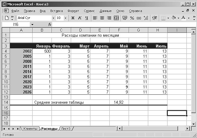 4. Щелкните на ячейке Н14, в которую переместилась ячейка с формулой среднего значения таблицы. В строке формул вы увидите текст =СРЗНА4 (B4:J12) (=AVERAGE (В4:312)). То есть область вычисления среднего значения автоматически расширилась на два вставленных столбца. Таким образом, формулы, работающие с массивами данных, автоматически адаптируются при увеличении размера массива.