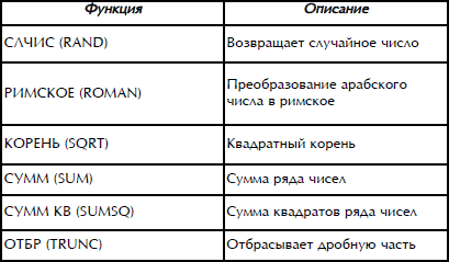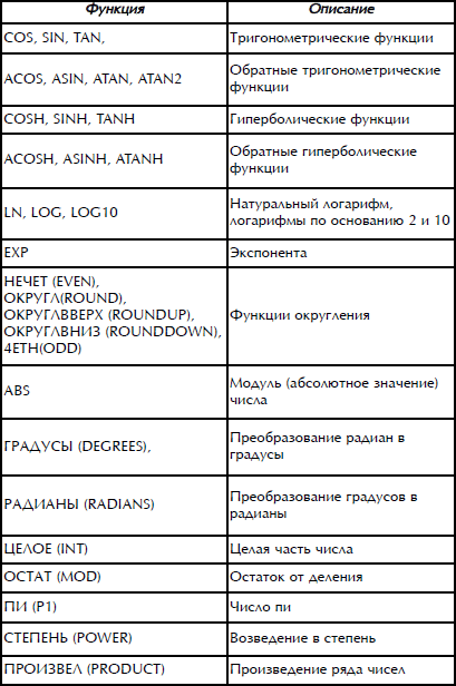 • Математические (Math & Trig) – математические и тригонометрические функции, некоторые из них приведены в таблице:
