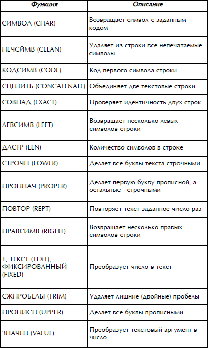 • Текстовые (Text) – функции для работы с текстовыми строками. Часть этих функций перечислена в следующей таблице: