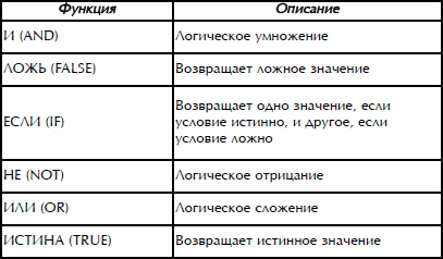 • Логические (Logical) – шесть функций для работы с данными логического типа, то есть величинами или условиями, принимающими значение Истина или Ложь: