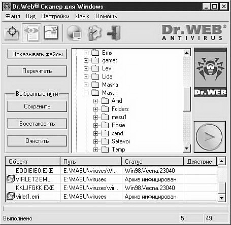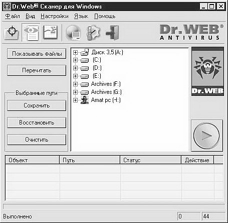 Немедленно после запуска программа, при настройках по умолчанию, проводит антивирусное сканирование оперативной памяти и файлов автозапуска Windows. Сканирование остальных объектов файловой системы производится по запросу пользователя. Файловая система представлена в центральной части окна в виде иерархического дерева. При необходимости его можно развернуть вплоть до каталогов любого уровня. Если такой уровень подробности недостаточен, нажмите на кнопку Показывать файлы. Выберите в иерархическом списке нужные объекты. На рисунке 7.2 изображена ситуация, в которой выбран для сканирования весь логический диск С: и один из файлов на дискете.