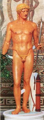 В V в. до н. э. в Афинах жил знаменитый скульптор Фидий. Его руке принадлежат не только статуи, предназначавшиеся в дар святилищу в Дельфах. (Вы помните, что, вероятнее всего, в этот дар входила и скульптура воина в нашем музее.) Ваятель создал великолепные скульптурные изображения богов из бронзы, слоновой кости и драгоценных камней. К сожалению, судить о них мы можем только по римским копиям и описаниям очевидцев. Из письменных источников известно о статуе Зевса для храма в Олимпии и Афины-Парфенос в Афинах.