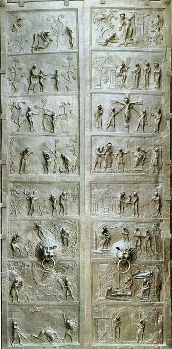 Бронзовые двери вели прежде в церковь святого Михаила в Гильдесгейме, которая была построена в 1010–1033 гг. Заказ на строительство церкви дал епископ Бернвард. Ему хотелось, чтобы церковь, в которой он будет похоронен, была богато украшена. Поэтому в 1015 г. епископ повелел сделать эскиз больших бронзовых дверей, а затем отлить их в бронзе. Если открыть бронзовые двери с рельефными изображениями